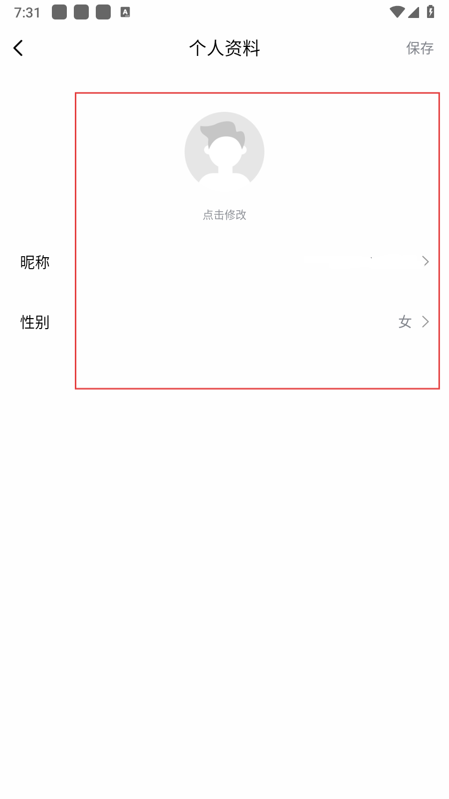 4、在个人资料页面可点击修改头像,输入昵称,选择性别,完成后点击【保存】即可更新个人资料。