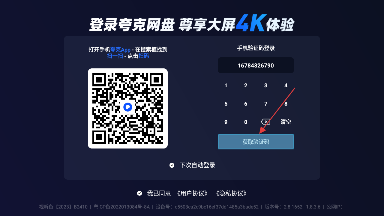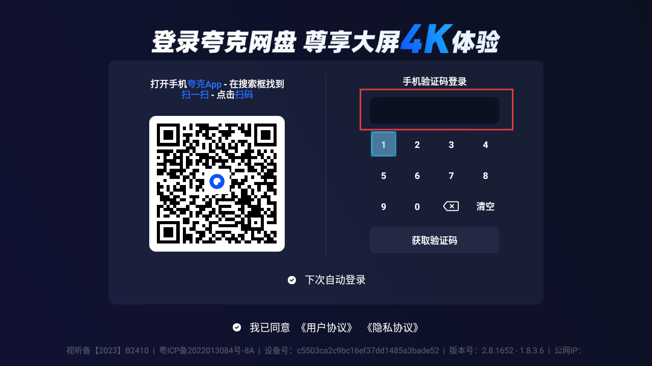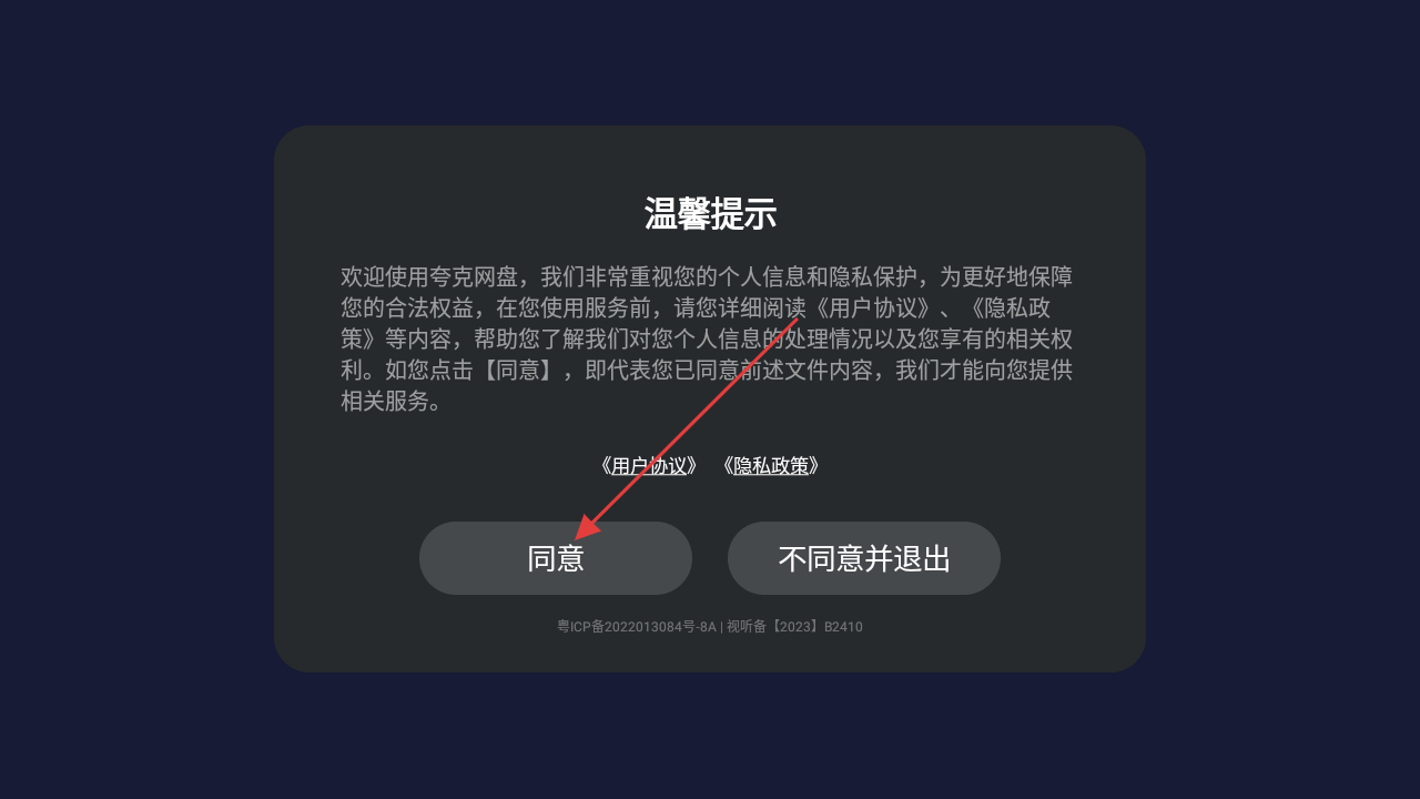 1、打开夸克网盘tv版,首先看到温馨提示页面,仔细阅读《用户协议》《隐私政策》后,点击【同意】按钮。
