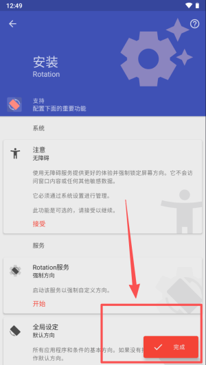 1、安装后点“接受”开启无障碍服务,允许强制旋转但无敏感数据访问。