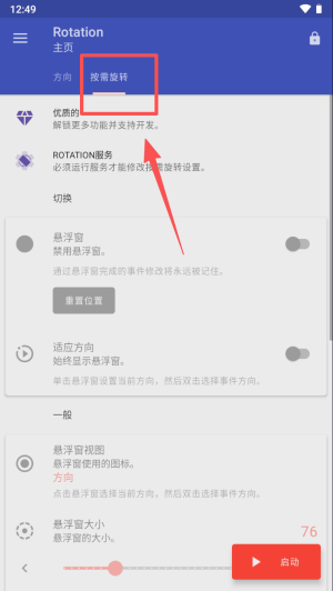 2、在主页点“启动”运行Rotation服务,关闭系统自动旋转并选默认方向。