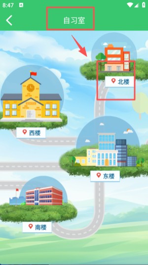 1、在首页的功能区域里,找到 “自习室” 选项并点击进入,页面会展示出不同楼宇的选项,比如北楼、西楼等。