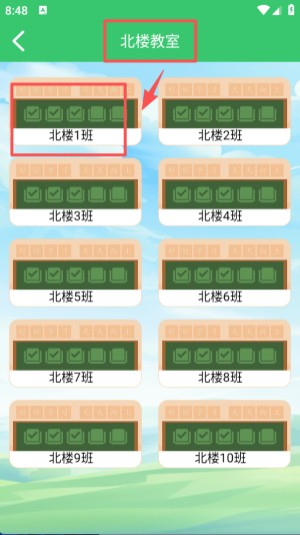 2、选定 “北楼” 后进入北楼教室页面,这里会列出多个班级选项,比如北楼 1 班、北楼 2 班等,选择其中一个班级。