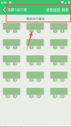 3、进入选定班级对应的自习室页面,页面上方会显示当前剩余的座位数量,下方则是具体的座位序号排布。
