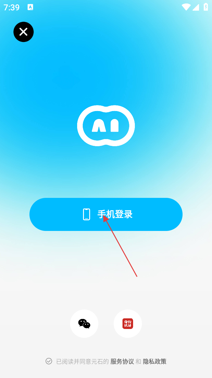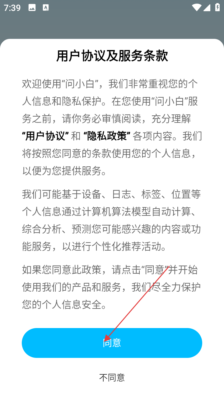 1、在“问小白”APP启动时,会弹出用户协议及服务条款界面,点击【同意】按钮,即可进入登录选择界面。