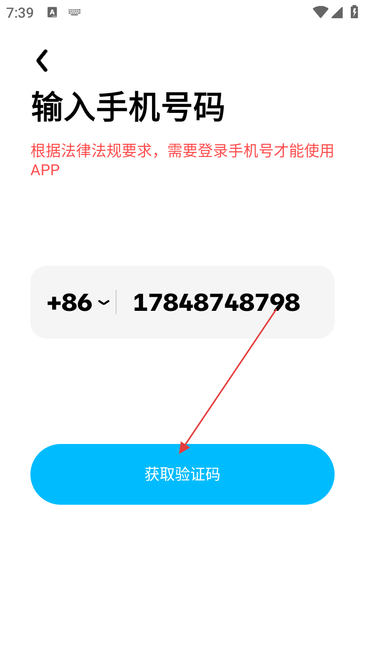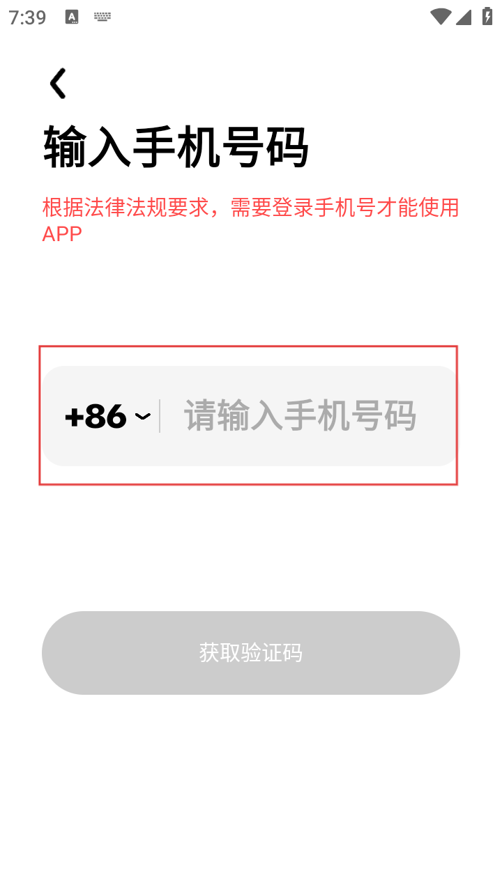 3、在手机号码输入界面,输入手机号码后,点击【获取验证码】按钮,获取并输入验证码。