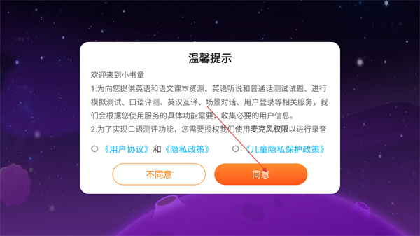 1、进入【小书童】前,需选择【用户协议】和【隐私政策】或【儿童隐私保护政策】,点击【同意】并授权麦克风权限。