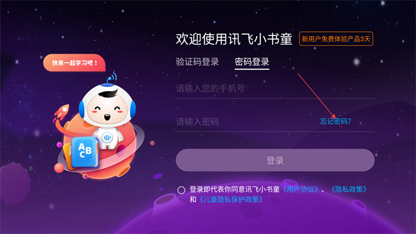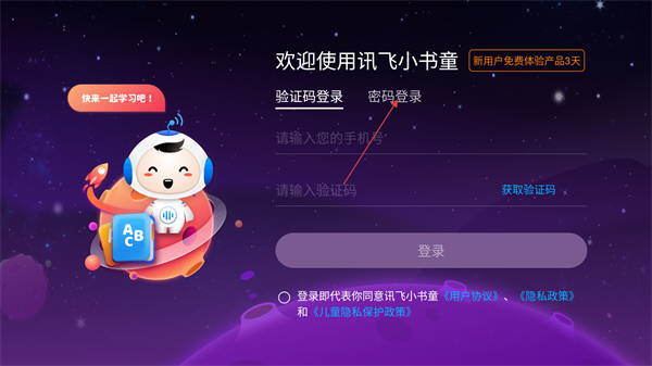 2、在【讯飞小书童】登录页,点击【密码登录】,切换至密码登录界面。