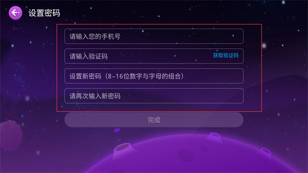 4、在【设置密码】界面,需依次填写手机号、获取验证码,设置两次新密码,完成后点击【完成】。
