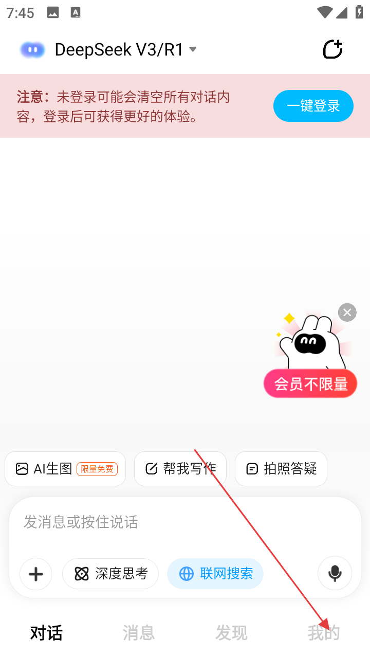 1、在对话界面,点击右下角【我的】按钮,进入个人中心,可查看登录状态、功能设置等入口。