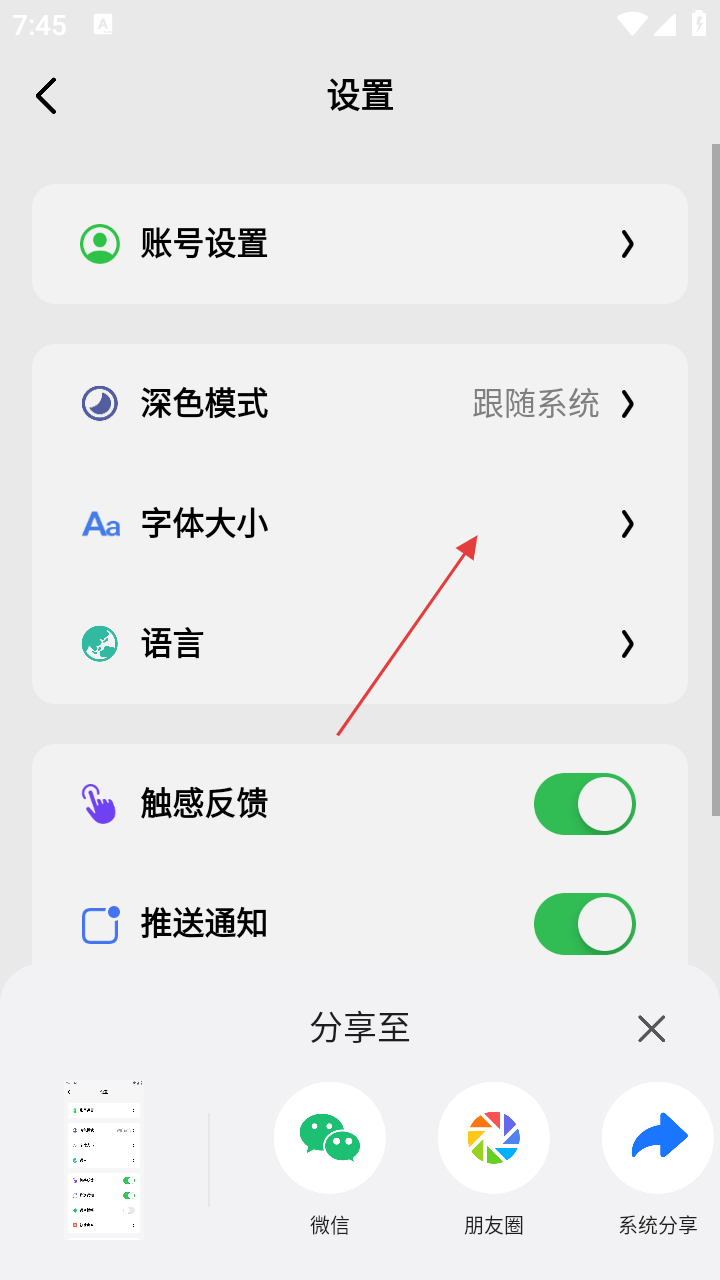 3、在设置界面中,点击【字体大小】选项,进入字体大小设置界面,可选择“较小”“标准”“较大”“更大”四种字号。