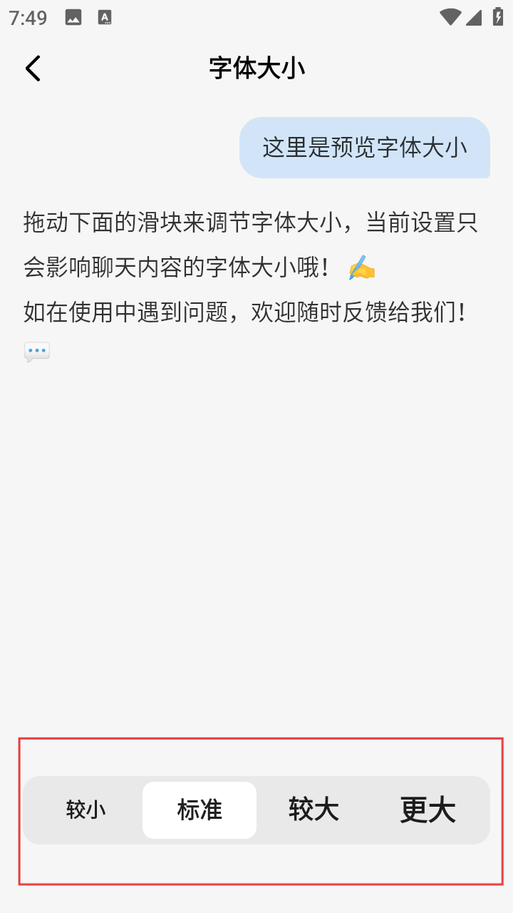 4、选择对应的字体大小后,APP聊天内容的字体将切换为所选字号,以适配不同的阅读需求。