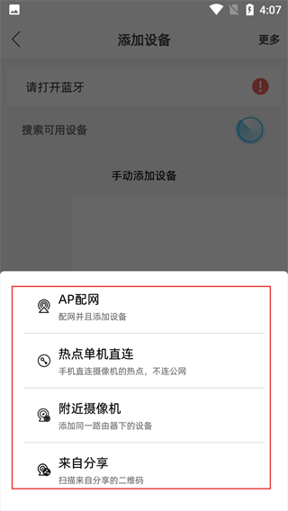 3、进入“添加设备”页面后,点击右上角【更多】,展开配网方式选项。