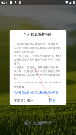 1、首次打开【文都医学】应用,需阅读《个人信息保护指引》,点击【同意】按钮以进入应用。