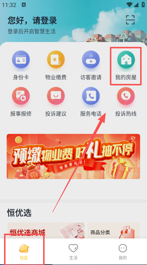 1、打开软件,点击底部 “社区”,在社区页面可找到 “我的房屋” 等功能入口。
