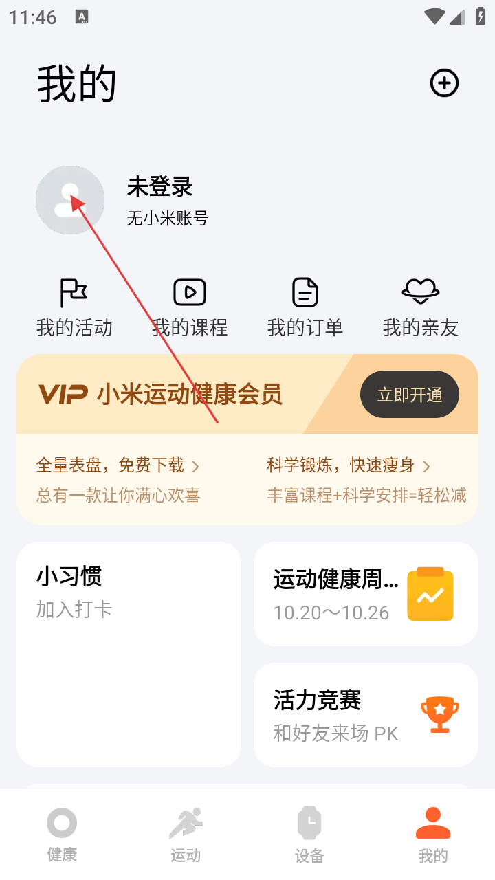 2、进入【我的】界面后,点击头像区域,可进入小米账号登录流程,以便体验更丰富的健康服务。