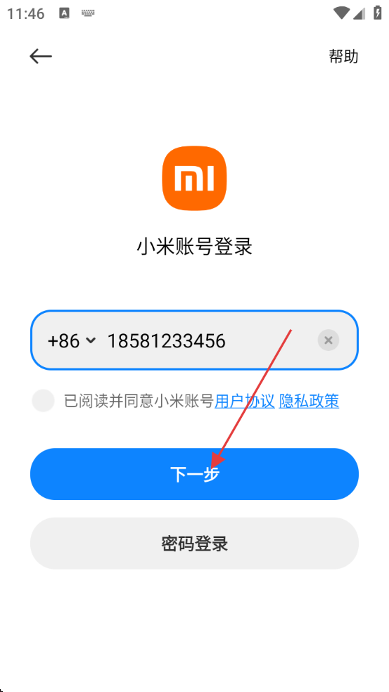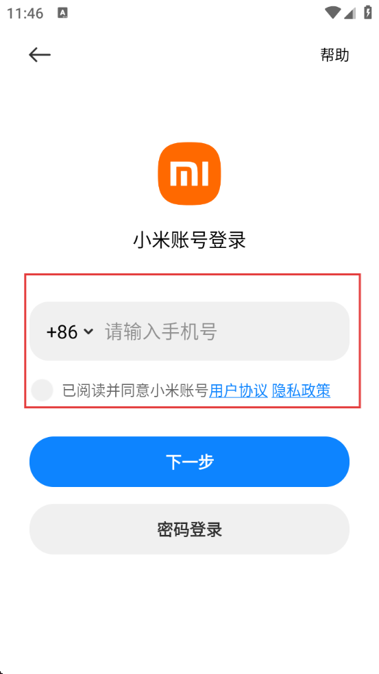 3、在小米账号登录界面,需输入手机号,并勾选同意【用户协议】和【隐私政策】,方可进行下一步操作。