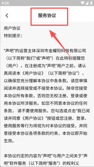 3、可查看服务协议,了解声吧的用户协议条款,确保充分理解后再进行后续操作。