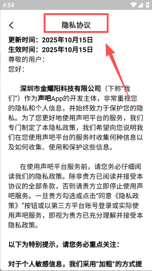 4、可查看隐私协议,了解声吧对用户隐私和个人信息的收集、使用及保护情况。