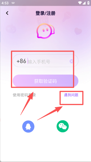 2、进入登录 / 注册界面,输入手机号后点击 “获取验证码”,若有问题可点击 “遇到问题”。