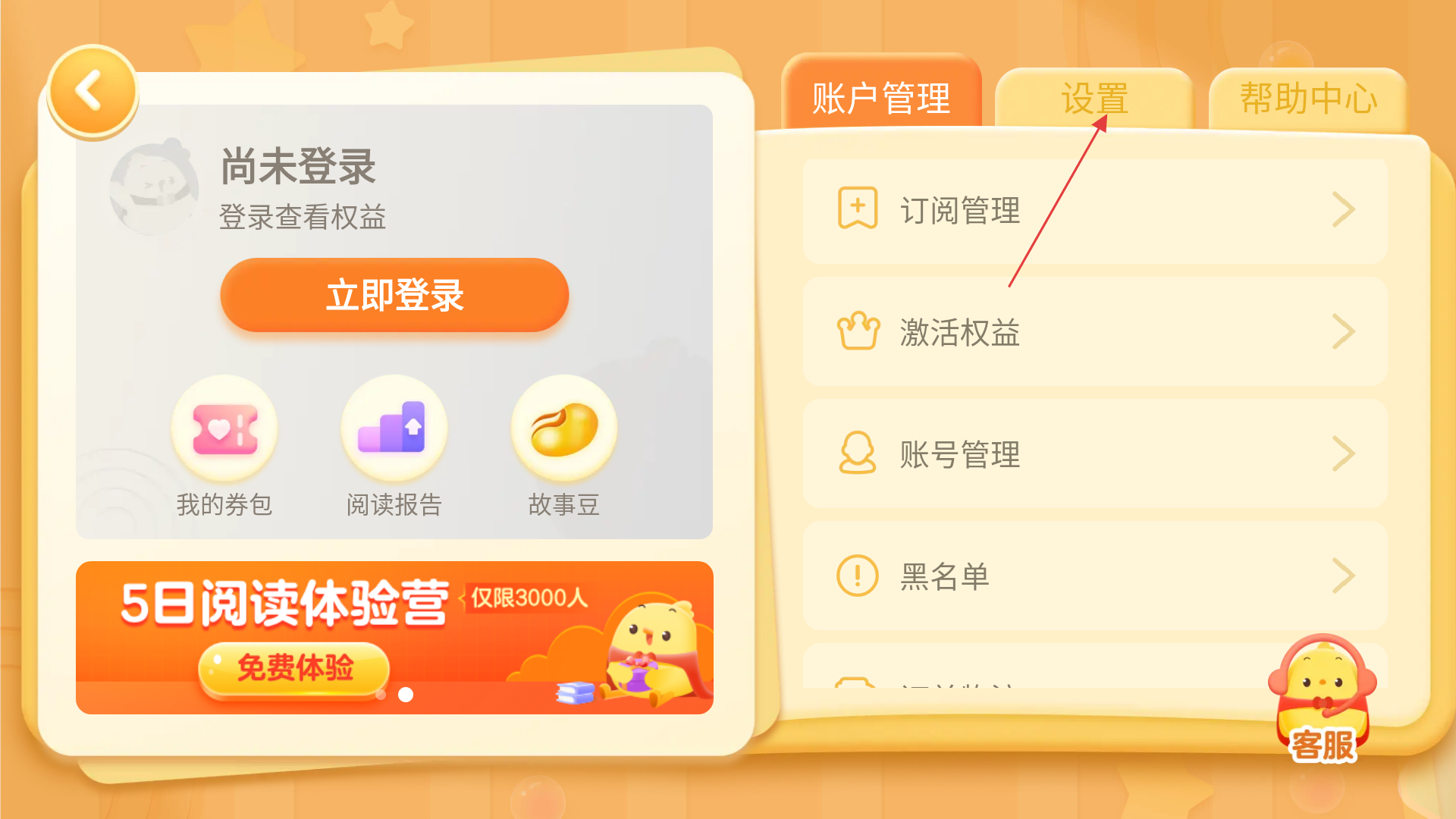 2、进入【家长中心】后,点击【设置】可进入设置界面,该界面有账户管理、帮助中心等板块,可进行各项功能设置。