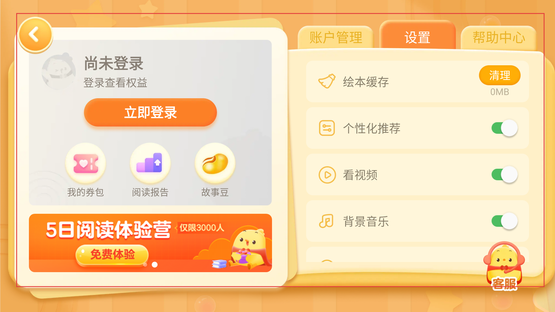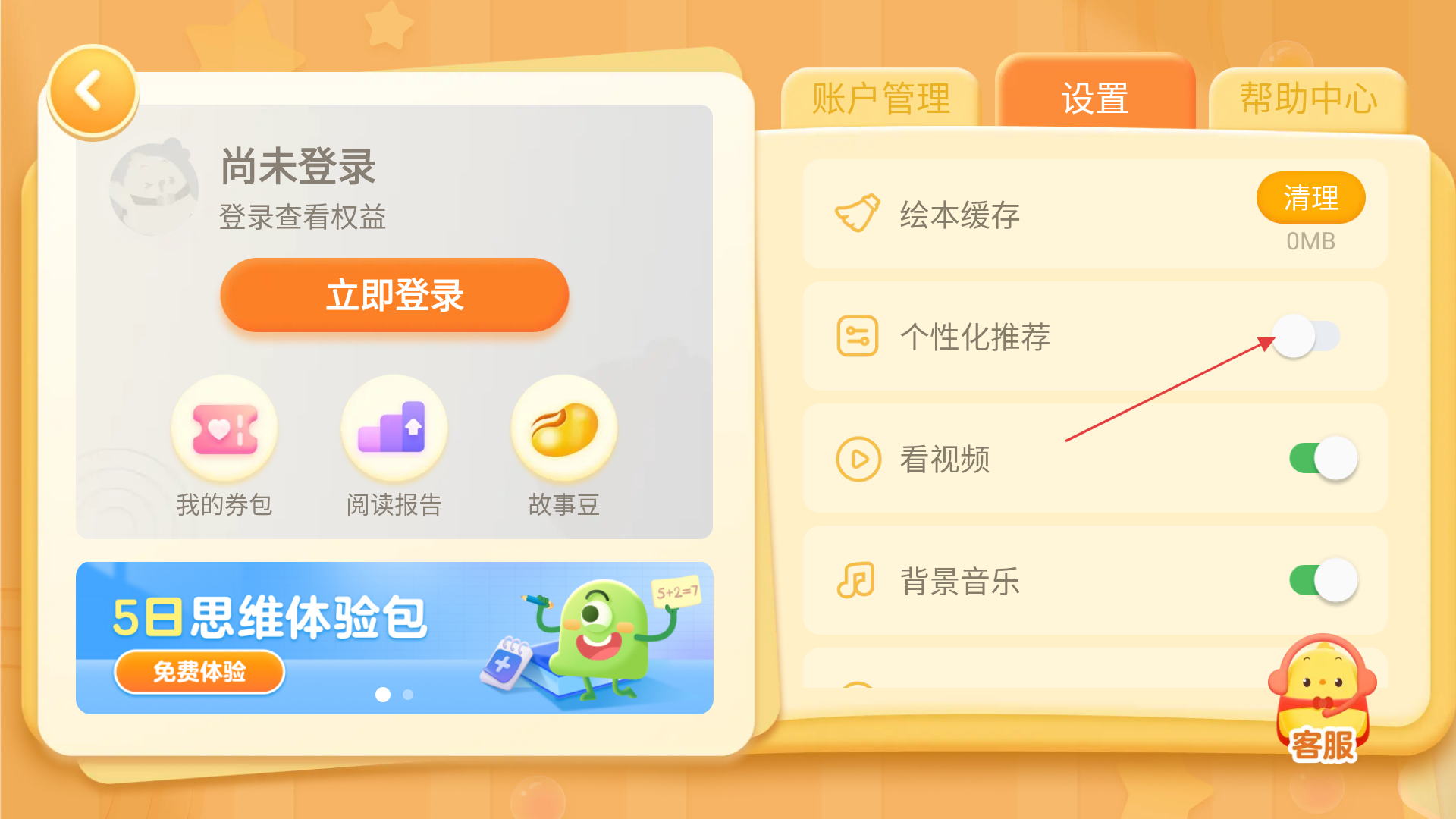 3、在【设置】界面,可开启【个性化推荐】功能,还能设置绘本缓存清理、看视频、背景音乐等功能的开关。
