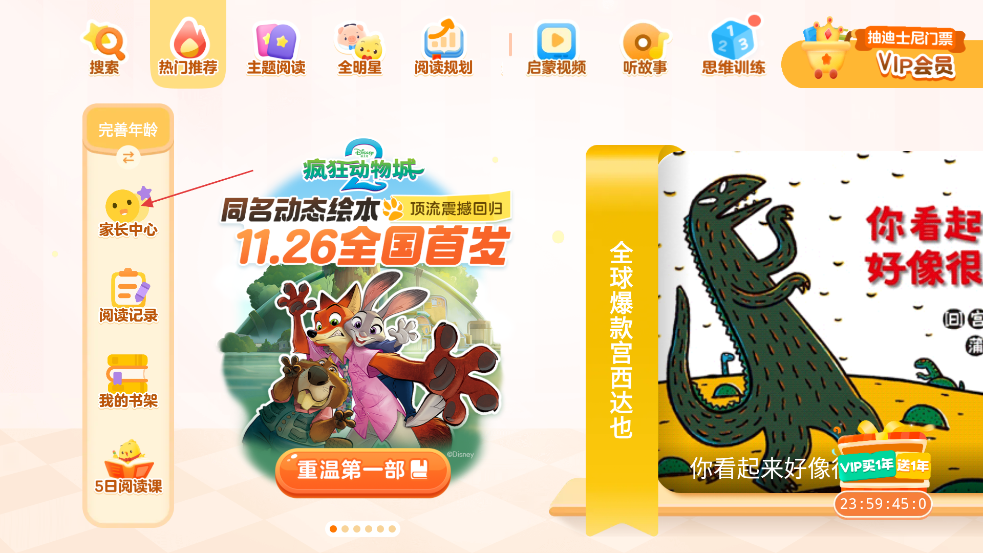 1、在叫叫绘本首页,有搜索、热门推荐等功能入口,点击【家长中心】可进入家长管理界面,还能查看阅读记录、我的书架等。