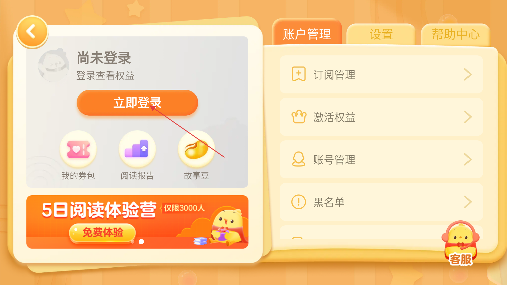 2、进入【家长中心】后,点击【立即登录】可进入登录界面,登录后可查看我的券包、阅读报告等权益。