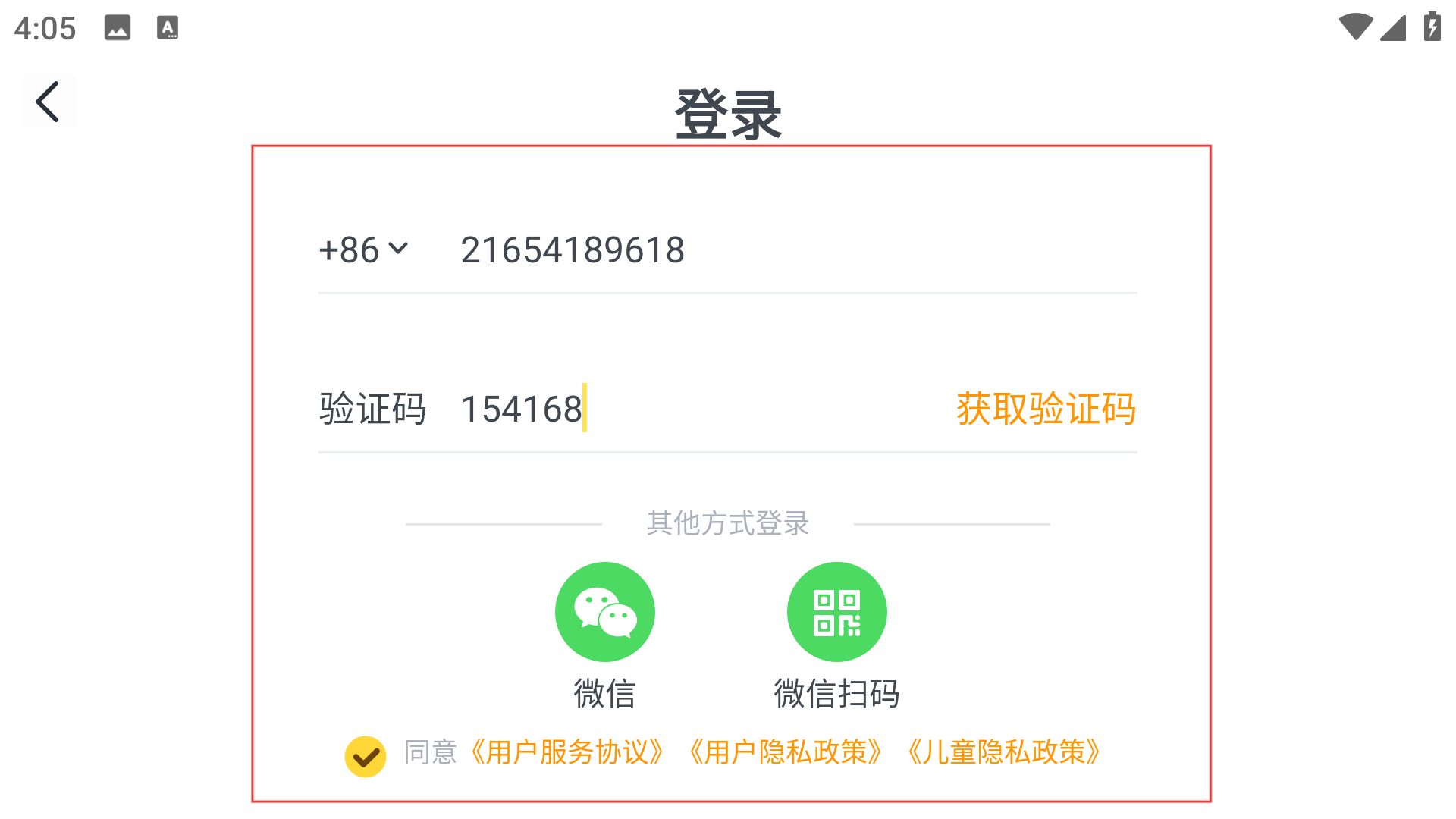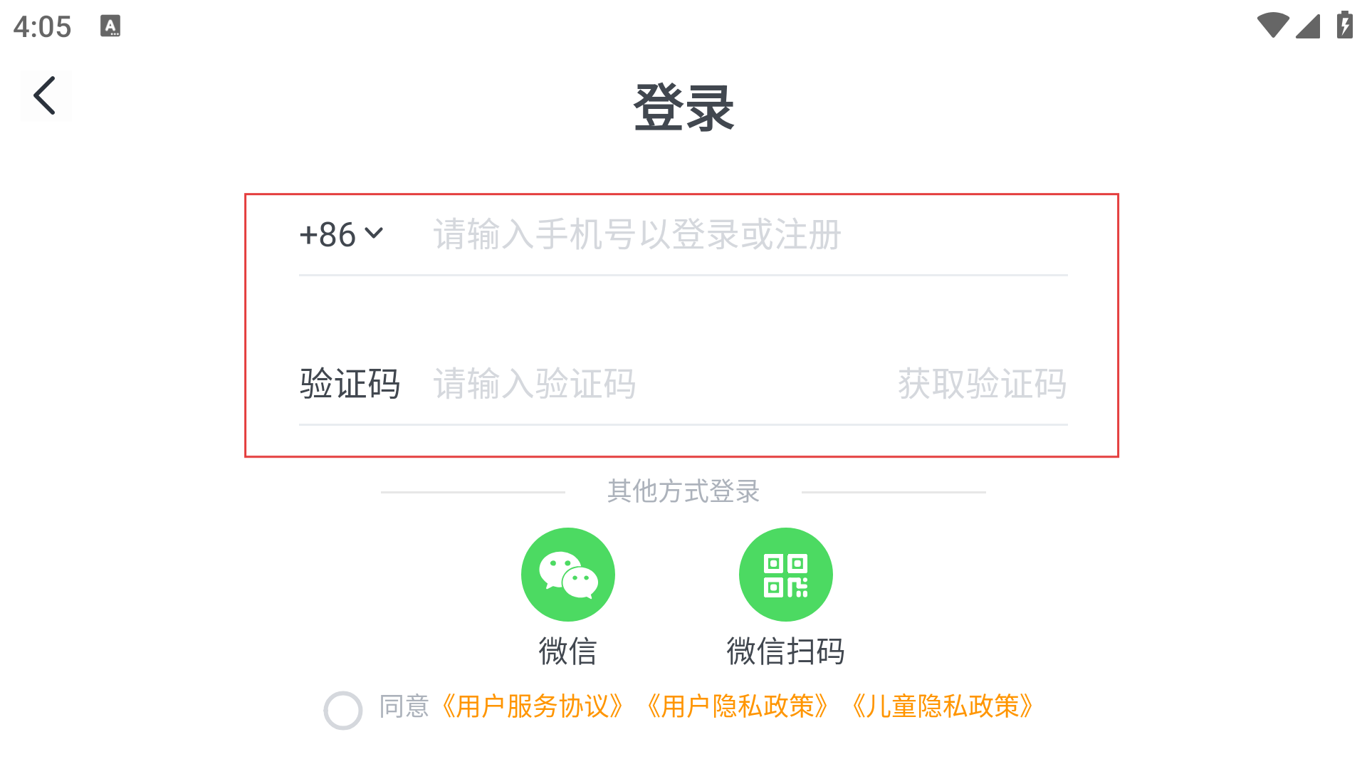 3、在登录界面,可输入手机号和验证码登录,也可选择微信或微信扫码登录,登录前需同意相关服务协议和隐私政策。