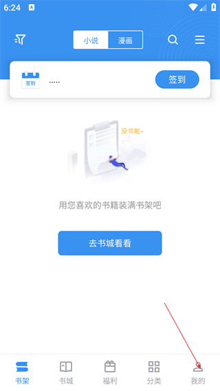 1、在书架页面可查看书籍,若想进行账号登录操作,点击右下角【我的】进入个人页面。