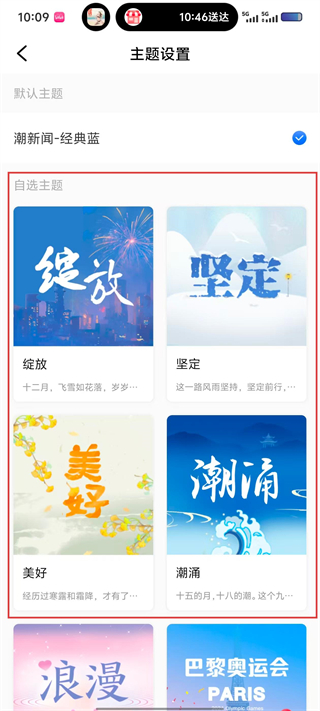 3、在“主题设置”界面,选择自主主题中的“潮涌”(或其他主题),点击进入主题预览页面。