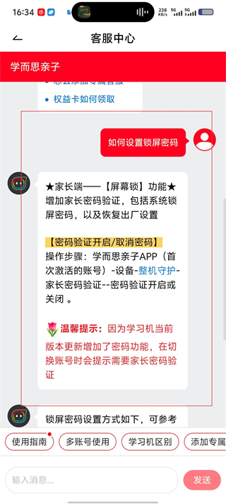 4、在客服对话中发送问题(如“如何设置锁屏密码”),会收到包含操作步骤的详细指引,可按流程完成设置。