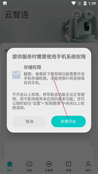 2、在权限申请弹窗中,点击【同意开启】,授予存储权限(用于功能正常运行)。