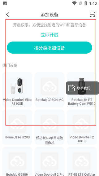 4、在添加设备界面,可选择开启权限,或直接通过【按分类添加设备】/热门设备列表,选择对应设备完成添加绑定。