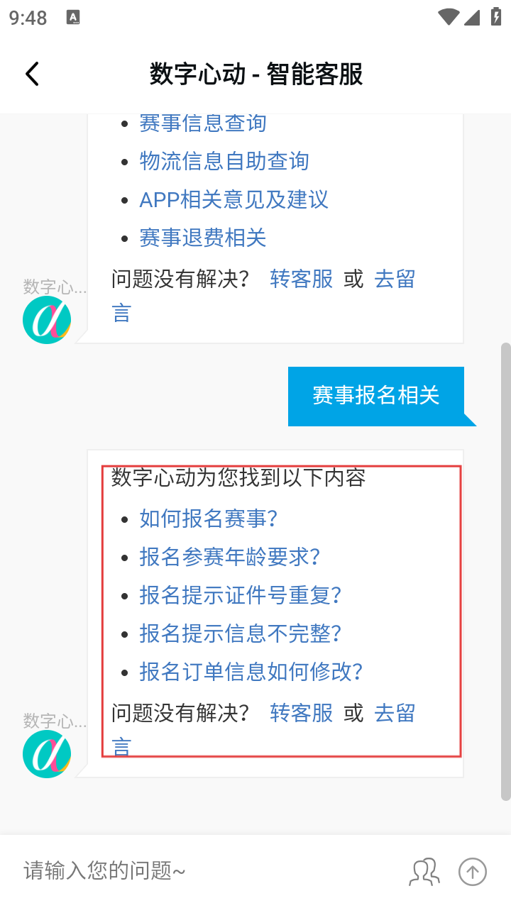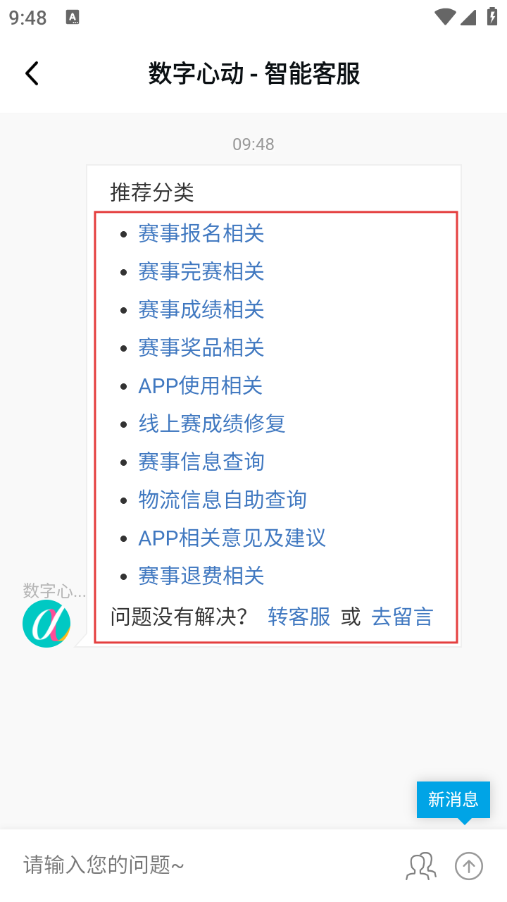 3、在智能客服页面,可看到推荐分类,包含赛事报名、完赛、成绩等多类问题分类。