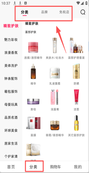 3、在分类页面中,选择“精致护肤”分类查看商品。