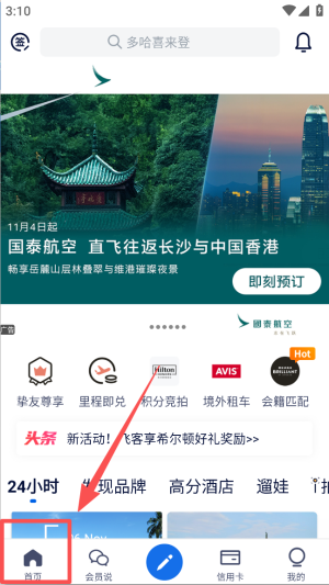 1、点击底部 “首页”,可看到国泰航空直飞往返等活动展示,还有挚友尊享、里程即兑等功能入口。
