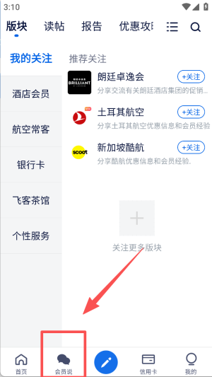 2、点击底部 “会员说”,进入后可查看我的关注板块,有酒店会员、航空常客等分类,还能关注相关品牌。
