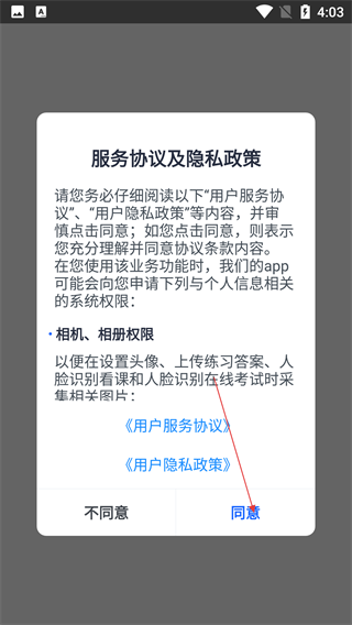 1、进入应用前,需阅读【服务协议及隐私政策】,确认后点击【同意】,以授权相机、相册权限并继续使用应用。