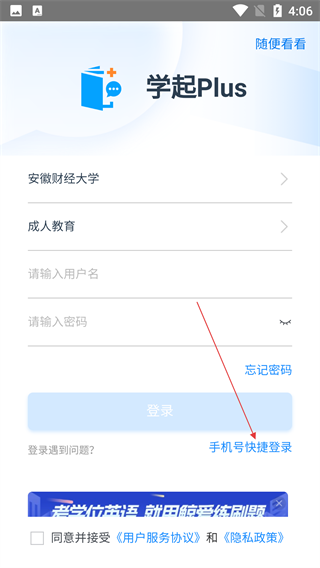 2、在【学起Plus】登录页,若常规登录遇阻,可点击【手机号快捷登录】选项,切换至手机号验证登录方式。