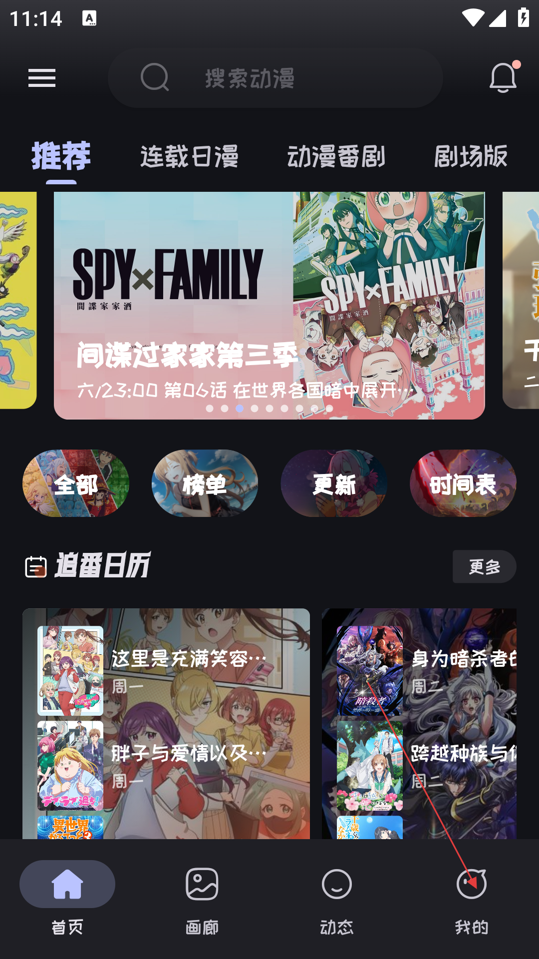 1、进入mi动漫首页,可浏览推荐动漫如《间谍过家家第三季》,还能通过【全部】【榜单】等功能分类查找动漫,点击底部【我的】。