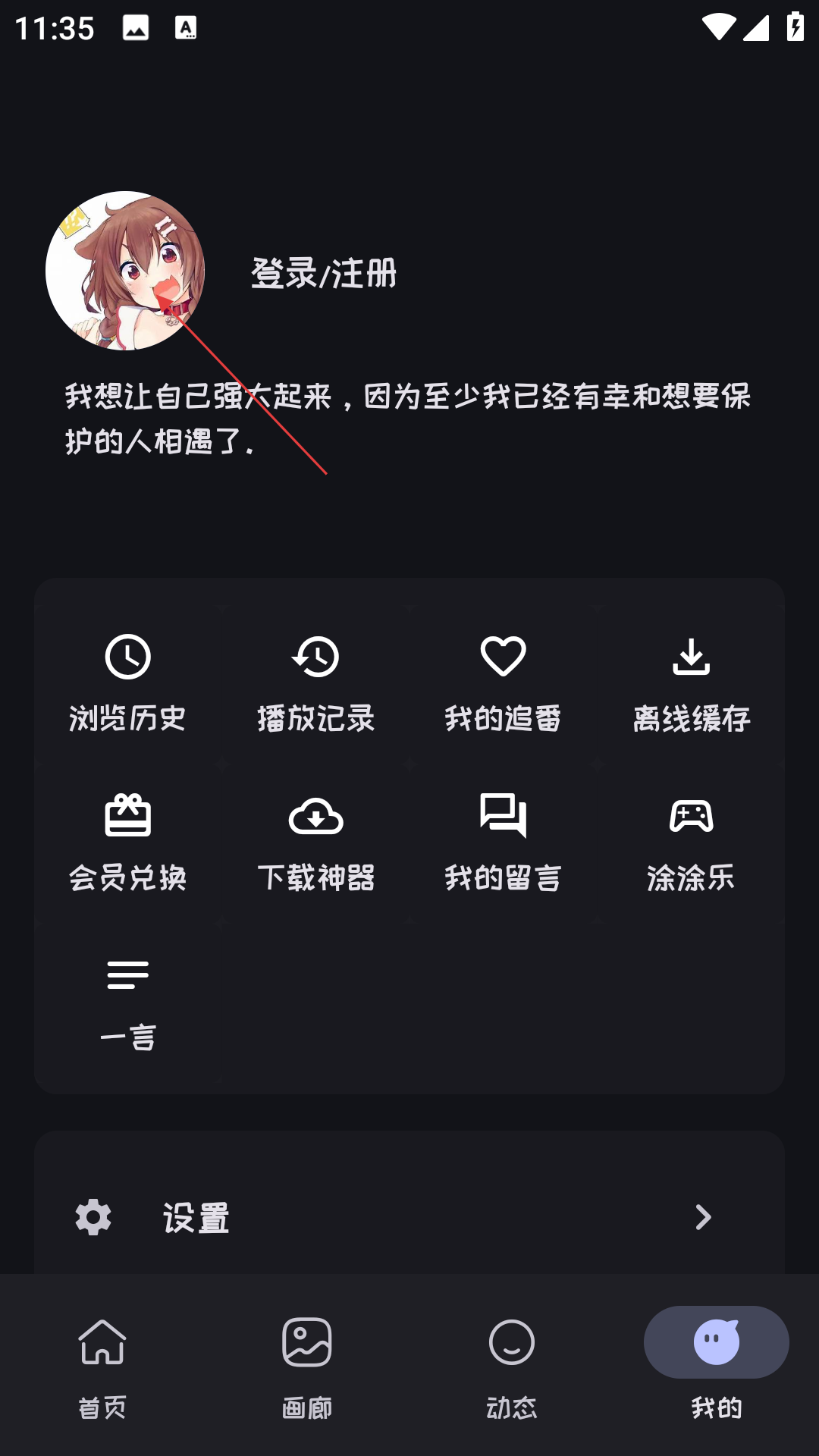 2、在【我的】界面可看到【登录/注册】入口,登录后能使用【我的追番】【离线缓存】等个性化功能。