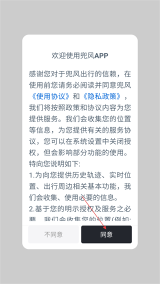 1、首次打开“兜风APP”,阅读《使用协议》和《隐私政策》提示,点击【同意】授权位置等信息权限,进入登录选择页面。