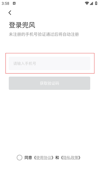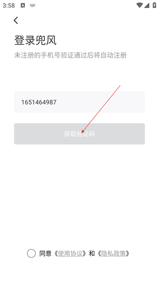 3、在登录页,输入手机号,勾选“同意《使用协议》和《隐私政策》”后,点击【获取验证码】。