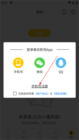3、登录选项中,选择【手机号注册】,可通过手机号创建新账号,同时记得勾选同意《用户协议》与《隐私政策》。