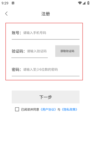 4、进入注册页面后,依次填写【手机号码】、获取并输入【验证码】、设置【密码】,勾选协议后点击【下一步】完成注册。