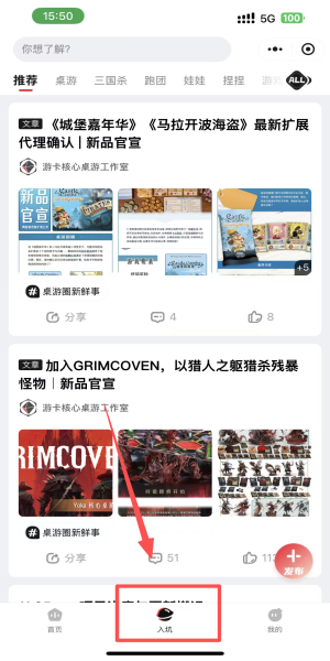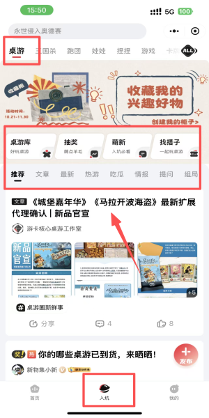 2、点击底部 “入坑”,进入后可浏览桌游相关的文章,如《城堡嘉年华》新品官宣等内容,还能参与讨论互动。