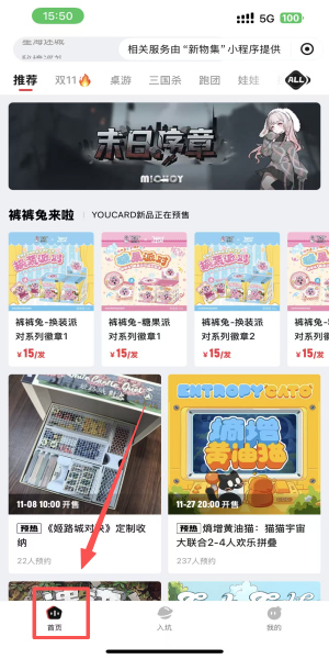 1、点击底部 “首页”,可看到推荐的各类商品,如裤裤兔系列徽章、姬路城对决定制收纳等,还有双 11、桌游等分类入口。