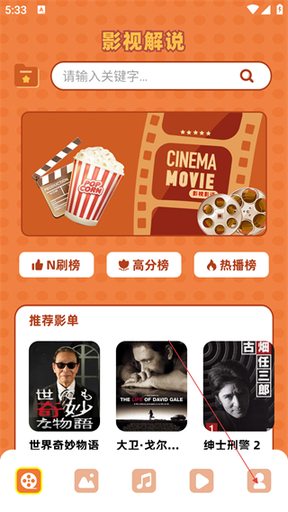 1、在影视解说首页可浏览推荐影单、各类榜单等内容,点击底部个人中心按钮可进入个人中心界面。