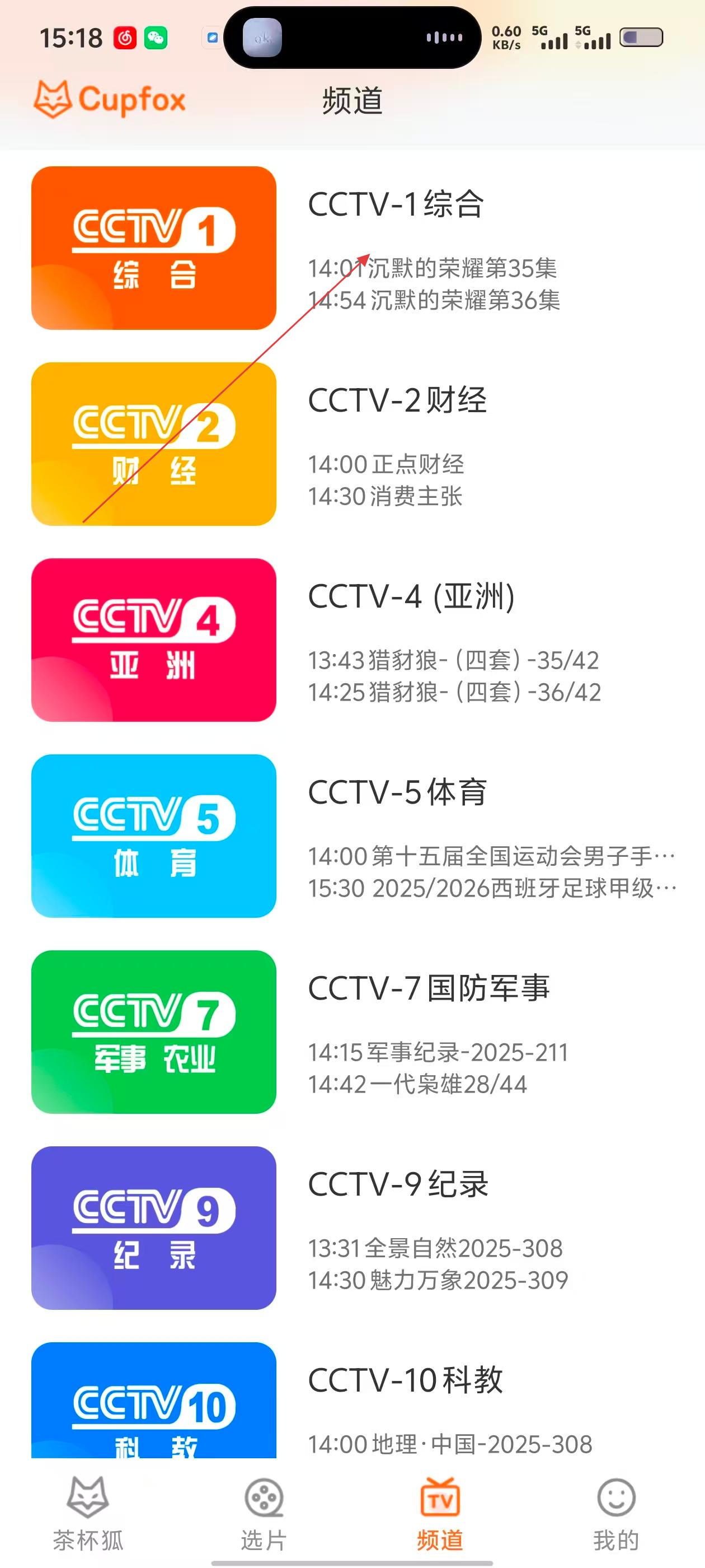 2、在频道页面选择想要观看的电视频道,如CCTV-1综合频道。