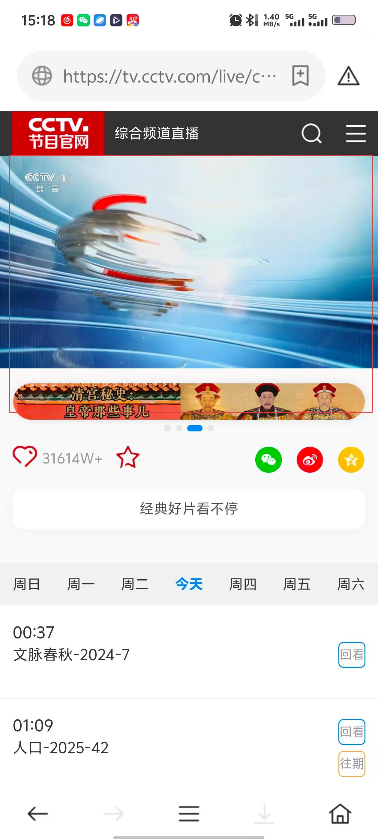 4、进入节目播放页面后,即可观看CCTV频道的直播或回看内容。